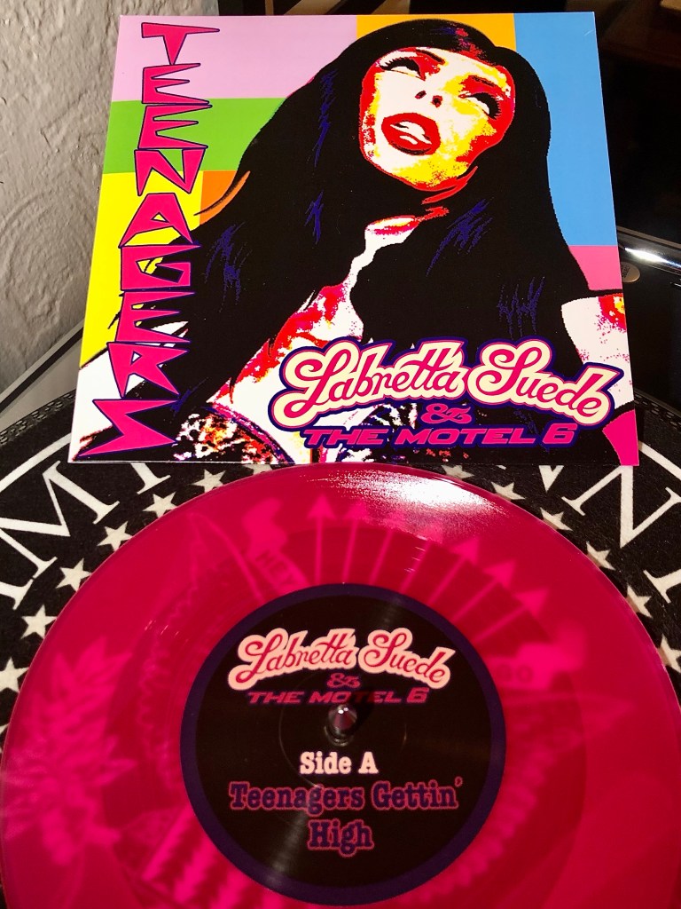 I was apparently hibernating in my cave during Labretta Suede & The Motel 6’s NYC residency in the early 2010s, and I somehow missed the dozen or so times they had played in Dallas during their multiple cross-country tours. Since Labretta and Moondog left New Zealand last year to make Dallas their homebase, I’ve seen them well over a dozen times, and we’ve become great friends. I got to see them reunite with their old NYC rhythm section, and after they returned to the Big Apple to make new recordings with their pal Matt Verta-Ray, I had the pleasure of having them come over and crank up the pre-mastered final mixes through my stereo so my neighbors could hear it (heard no complaints). On this hot as the Texas summer 45 they deliver the high school confidential with the organ accented “Teenagers Gettin’ High”, while their dirty spin on the Flamin’ Groovies’ classic makes me wanna yell “It’s alive! It’s alive! IT’S…ALIVE!!!” It’s simply been a joy and a never-ending chorus of laughs hanging with these weirdo rock ‘n’ roll true believers. I’m thrilled to have this brand new, hot pink piece of wax from LSM6!!!
