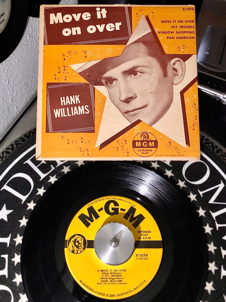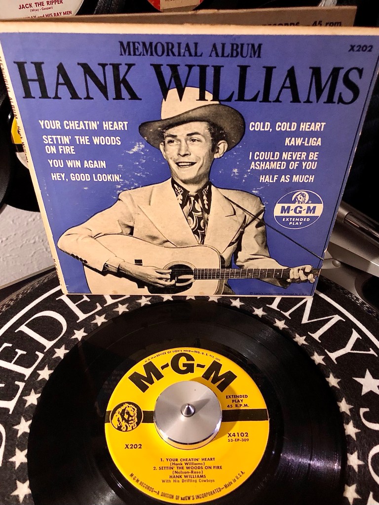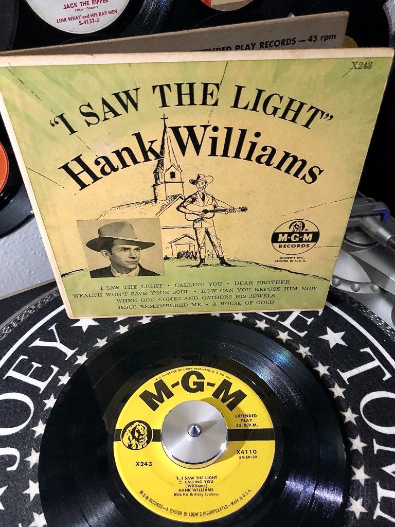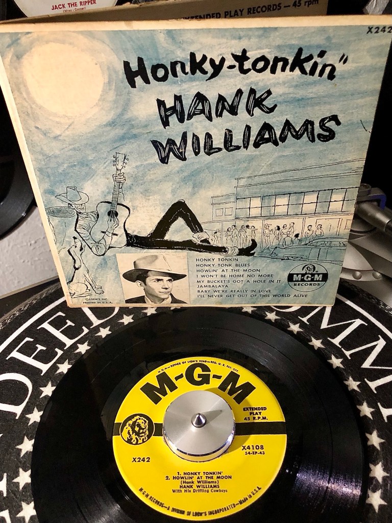One of the many aspects of Hank Williams’ career that fascinates me endlessly is how MGM Records released his records, before and after his passing. He had released 31 singles and two 10” “mini-albums” in his six year recording career. MGM released his first six albums in a very unusual manner. When Hank began his recording career, the 78 rpm single was the dominant format, with the 45 rpm single arriving in 1949. The long playing disc (or LP) dates back to Edison in 1926, but it was RCA Victor that came out with the first commercial 33 1/3 rpm 12” in 1931, however since few could afford the playing equipment during the Depression, it was a failure. In 1948, Columbia Records improved the technology with its “microgroove” vinyl disc that could hold 23 minutes of music per side. However it would be almost another decade before the LP would outsell 45s and make the 78 single obsolete. When MGM decided to release Hank’s first LP, Hank Williams Sings, it was a 8-song 10” 33 1/3 rpm disc, but because LPs were still considered a bit of a novelty, it was also released in 4-disc sets in both the 78 and 45 formats. They would repeat this weird marketing method for his first six albums, also releasing 2-disc 45 Extended Play (EP) sets. They would later reissue these albums as 12-song 12” LPs with additional tracks, except for his first album.
