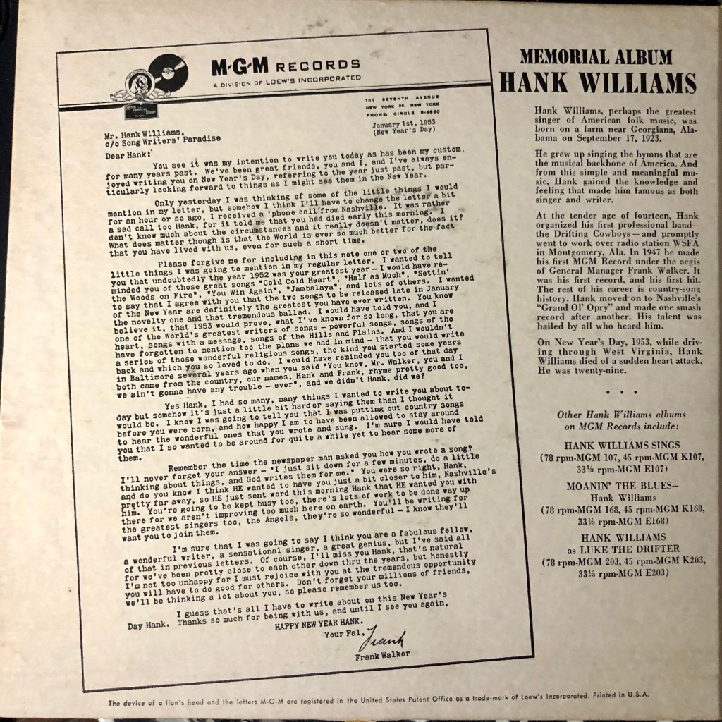 Memorial Album was the first album and retrospective of Hank’s career to be released after his death, with the usual 8-song 78/45/LP releases, but also a 2 disc 45 EP set which I have. Inside the gatefold is a letter written by Frank Walker hours after learning of Hank’s passing. I also have a 1959 reissue of the expanded 12 track LP, which has some of the lamest cover art. I’ve included the full album on the playlist.